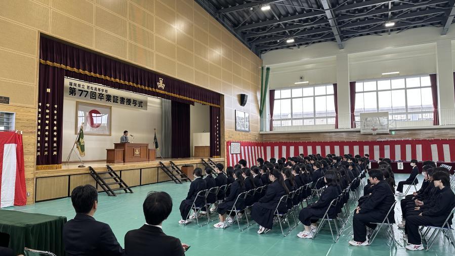 本日、快晴の元、第77回若松高等学校卒業式が行われ、卒業生111名が学舎を巣だっていきました。